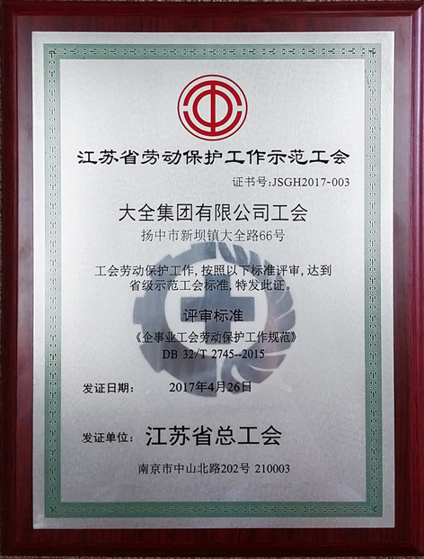 2017年,大全集团有限公司工会获得“江苏省劳动保护工作示范工会”称号。7月5日,镇江市总工会副主席徐炳辉在镇江市总工会生产保护部部长谢天白、扬中市总工会主席管拥军、扬中市总工会副主席王德洲等人陪同下到大全集团进行授牌,集团工会主席、副总裁蔡斌接待。