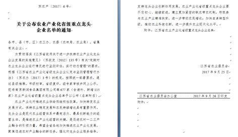 大全农业通过江苏省农业产业化省级重点龙头企业认定