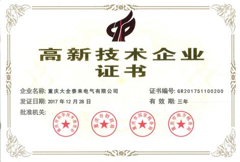 重庆大全泰来电气获评“重庆市高新技术企业”