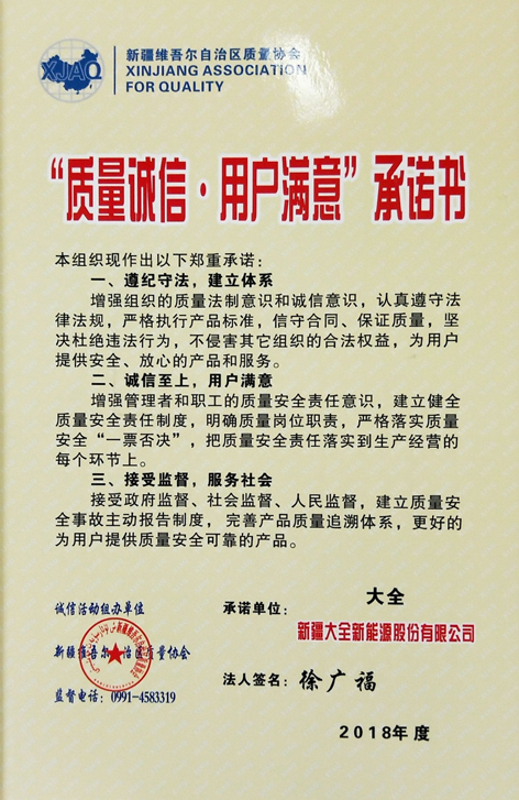 新疆大全新能源荣获“质量诚信,用户满意”承诺书