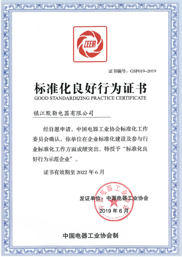 “中国电器工业标准化良好行为示范企业”是由中国电器工业协会标准化工作委员会组织,主要从企业参加标委会及担任职务情况、企业标准体系建设情况、企业标准公开情况、企业优势及主导产品执行标准情况、标准实施给企业带来的经济效益及社会效益情况、企业参与行业及国际标准化活动情况、专利证书情况及标准化人才队伍建设情况等各方面对企业进行的综合性评估。