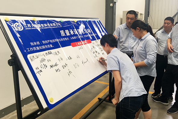 大全箱变:9月9日,大全箱变开展“质量月”质量承诺签名活动,公司总经理带领全体员工宣读质量承诺书,并在质量承诺看板上签名。活动要求全体员工将承诺落到实处,严格按照岗位职责认真履行工作职责,进一步提升公司的产品质量、工作质量和服务质量水平。
