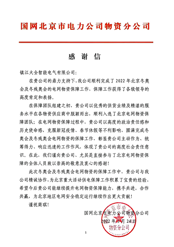 3月24日,镇江大全智能电气有限公司收到国网北京电力公司物资分公司发来的感谢信。信中,国网北京电力公司物资分公司对大全智能为2022年北京冬奥会及冬残奥会提供的中压开关设备和保障工作给予高度肯定和表扬。感谢大全智能在工期紧、任务重的压力下,凝心聚力、攻艰克难顺利完成设备交付;在冬奥会期间,派遣资深服务人员驻守北京,放弃春节与家人团圆、克服疫情困难,随时待命保障设备顺利运行。
