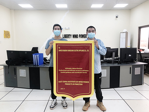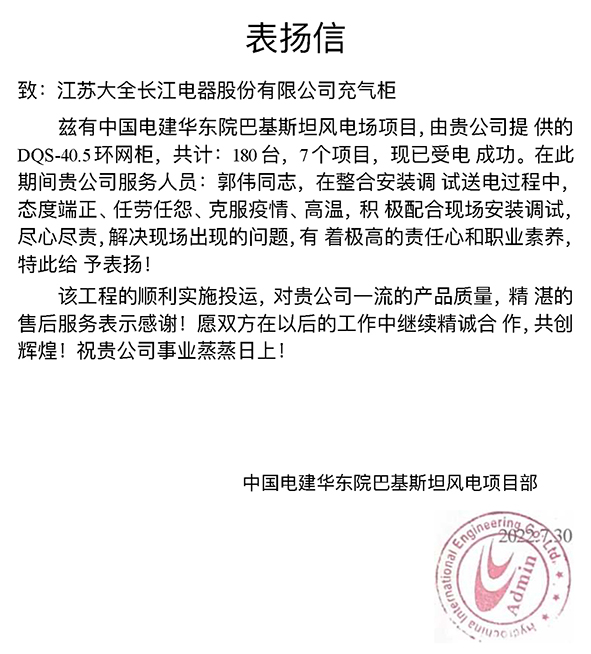 近日,大全集团下属江苏大全长江电器股份有限公司收到一封来自中国电建华东院巴基斯坦风电项目部的锦旗和表扬信。表扬信上,巴基斯坦风电项目部对长江股份公司一流的产品质量、精湛的售后服务表示感谢,对公司充气柜事业部服务工程师郭伟同志专业高效的服务和敬业精神给予表扬。