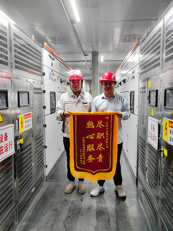 “尽职尽责、热心服务”。由于广西华友锂业项目紧急,南京大全电气迅速安排服务工程师入驻,配合项目业主加班加点赶进度,现场指导安装、提供技术支持,不到一周的时间便顺利完成送电任务,高效保障了项目的正常运行。