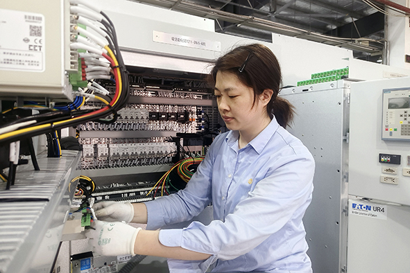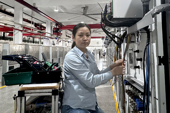 在总装车间密集的线束丛中,朱婷以毫米级精度编织着工业艺术的经纬。作为行线工,她十三年如一日钻研箱变二次线接线技艺,凭借“放线精准如尺,行线流畅如诗”的绝活,将接线合格率保持在99.8%以上,被誉为“行走的质量标杆”。面对华为项目,她主动请缨组建攻坚小组,通过多次工艺改良试验,创新“三维走线法”,破解布线难题,使生产效率提升30%,项目交付获客户点赞。她热爱工作,潜心钻研,乐于助人,将自己总结的行线经验无私地分享给同组同事,并指导新人掌握高难度接线技巧。华为样机打样期间,她精心整理的《华为行线标准化笔记》成为车间培训教材以及工艺素材。