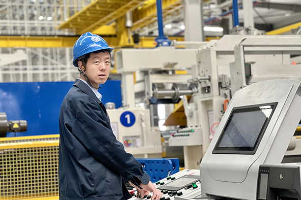 严谨是纵剪线上青年操作工夏镇的常态。面对高精度的变压器铁芯加工要求,只见他紧盯着纵剪线操作台的显示屏,反复核对设备参数,手指在操作面板上快速敲击。每当一卷硅钢片进入纵剪区域,他便俯身贴近设备,耳朵捕捉刀具切割时细微的震动声,眼睛则紧盯测量仪跳动的数字,连续数小时全神贯注地监控每一次裁剪,使生产误差控制在极小范围,不仅保障了产品质量,更为后续工序的顺利开展奠定了坚实基础。