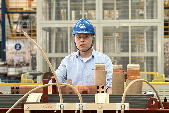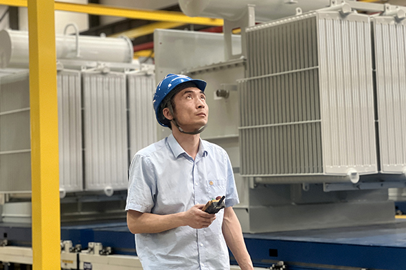 忙碌的产线上,蔡彬频繁穿梭在重达数吨的铁芯与绕组之间,眼神专注地测量每一个部件的间隙。变压器总装工序是决定产品性能与安全的“最后一道关卡”,每台变压器的装配,蔡彬都要重复上千次螺栓紧固、线圈对位。面对繁重任务,他总是主动挑起大梁,严格把控每处细节。总装工序涉及多个环节,需要团队成员紧密配合,蔡彬深知团队的力量,工作中他主动与各工序同事积极沟通,及时反馈问题,致力实现产品零返工的质量突破。