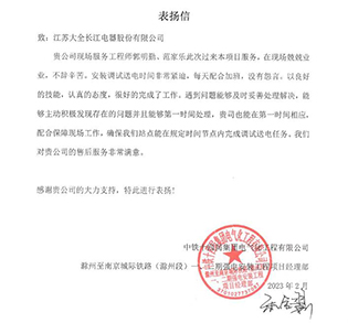 滁宁城际铁路是全国首条跨省城际铁路。3月21日,滁州至南京(滁宁)城际铁路(滁州段)一期工程、二期工程顺利通过工程项目验收,工程正式进入全面竣工验收阶段,通车运营进入倒计时。近日,中铁十四局集团电气化工程有限公司向江苏大全长江电器股份有限公司发来感谢信。